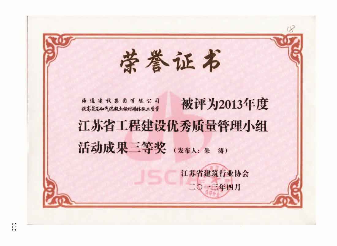 工程建設(shè)優(yōu)秀質(zhì)量管理小組活動(dòng)成果三等獎(jiǎng)