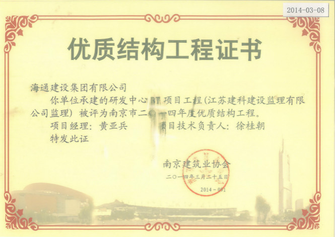 BT項(xiàng)目工程2014年度優(yōu)質(zhì)結(jié)構(gòu)工程
