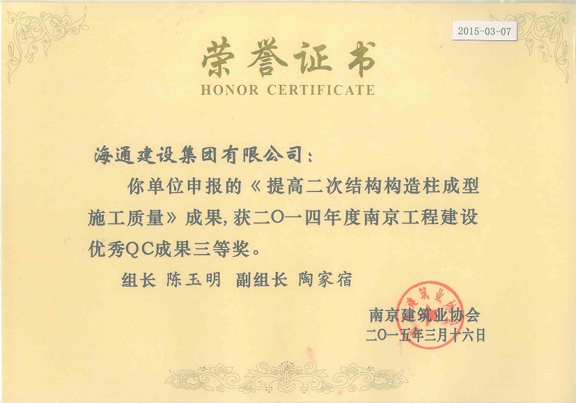 南京工程建設(shè)優(yōu)秀QC成果三等獎
