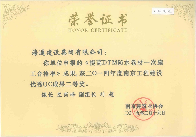 南京工程建設(shè)優(yōu)秀QC成果二等獎