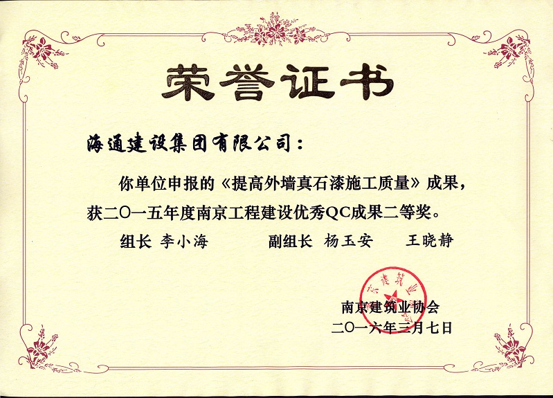 南京工程建設(shè)優(yōu)秀QC成果二等獎