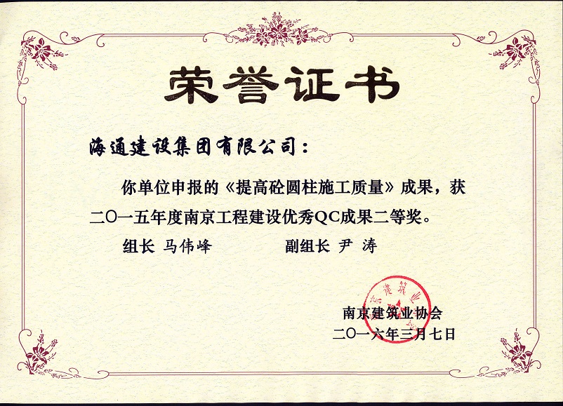 南京工程建設(shè)優(yōu)秀QC成果二等獎(jiǎng)
