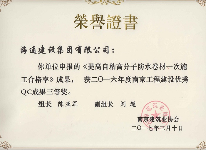 南京工程建設(shè)優(yōu)秀QC成果三等獎(jiǎng)