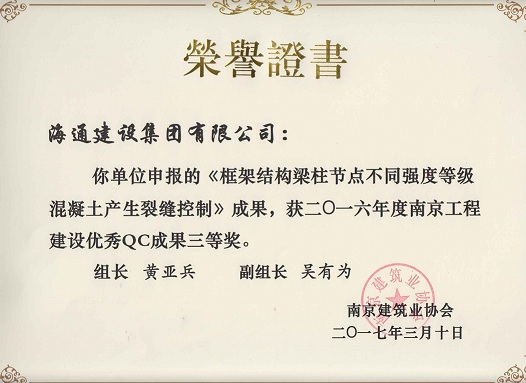 南京工程建設(shè)優(yōu)秀QC成果三等獎(jiǎng)
