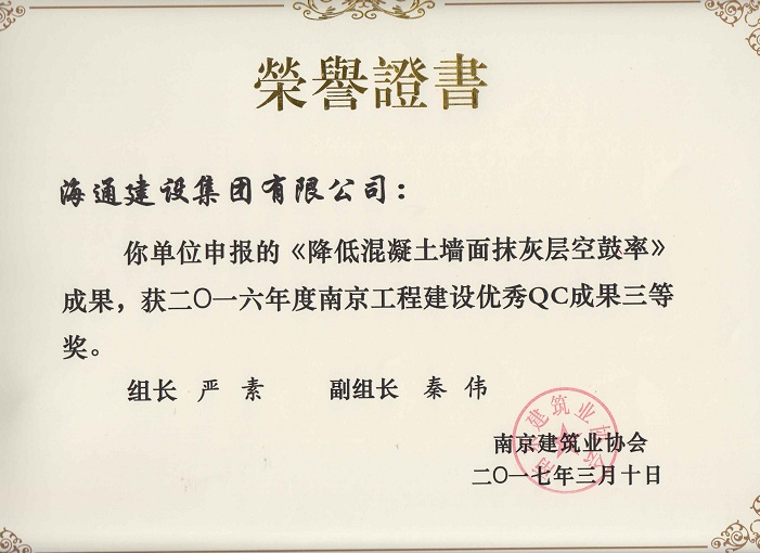 南京工程建設(shè)優(yōu)秀QC成果三等獎