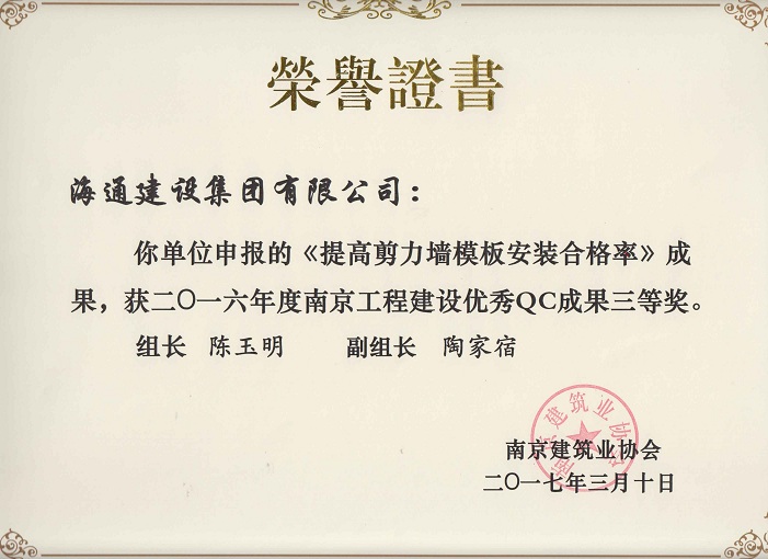 南京工程建設(shè)優(yōu)秀QC成果三等獎(jiǎng)