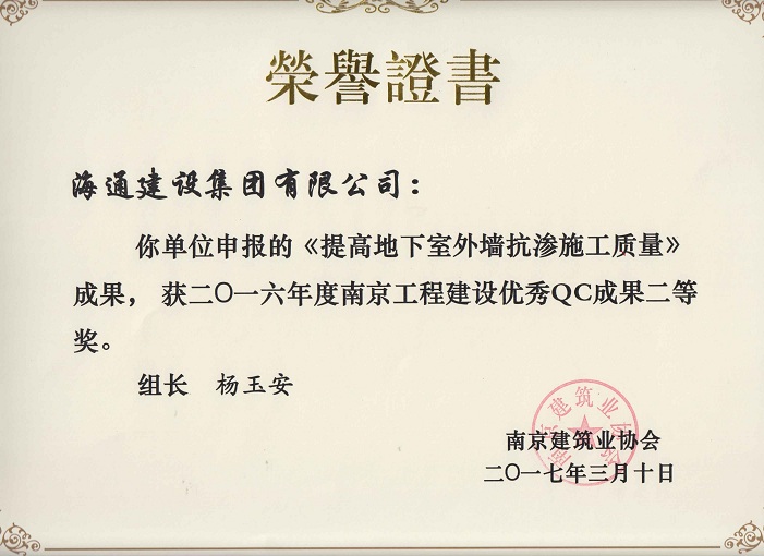 南京工程建設(shè)優(yōu)秀QC成果二等獎(jiǎng)