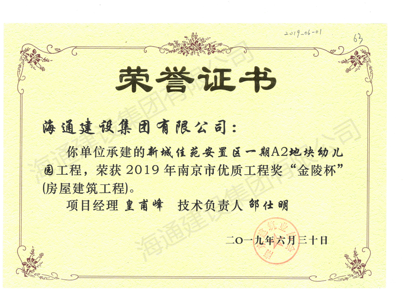 南京市金陵杯2019新城佳苑安置區(qū)一期A2地塊幼兒園工程